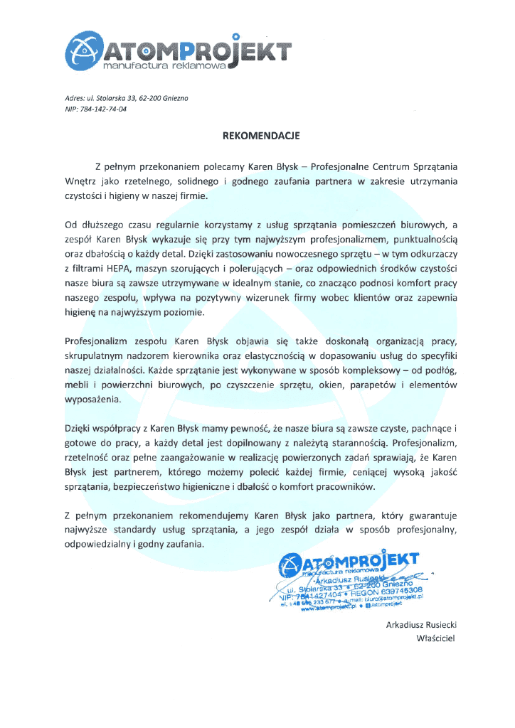 Rekomendacja od firmy HELPKOMP, która korzystała z naszych usług sprzątania biura. Współpraca została oceniona jako jedna z najlepszych decyzji dzięki wysokiej jakości usług, elastycznym cenom i profesjonalnemu podejściu zespołu. Zaufanie i zadowolenie naszych klientów biznesowych to dla nas najważniejsza nagroda.