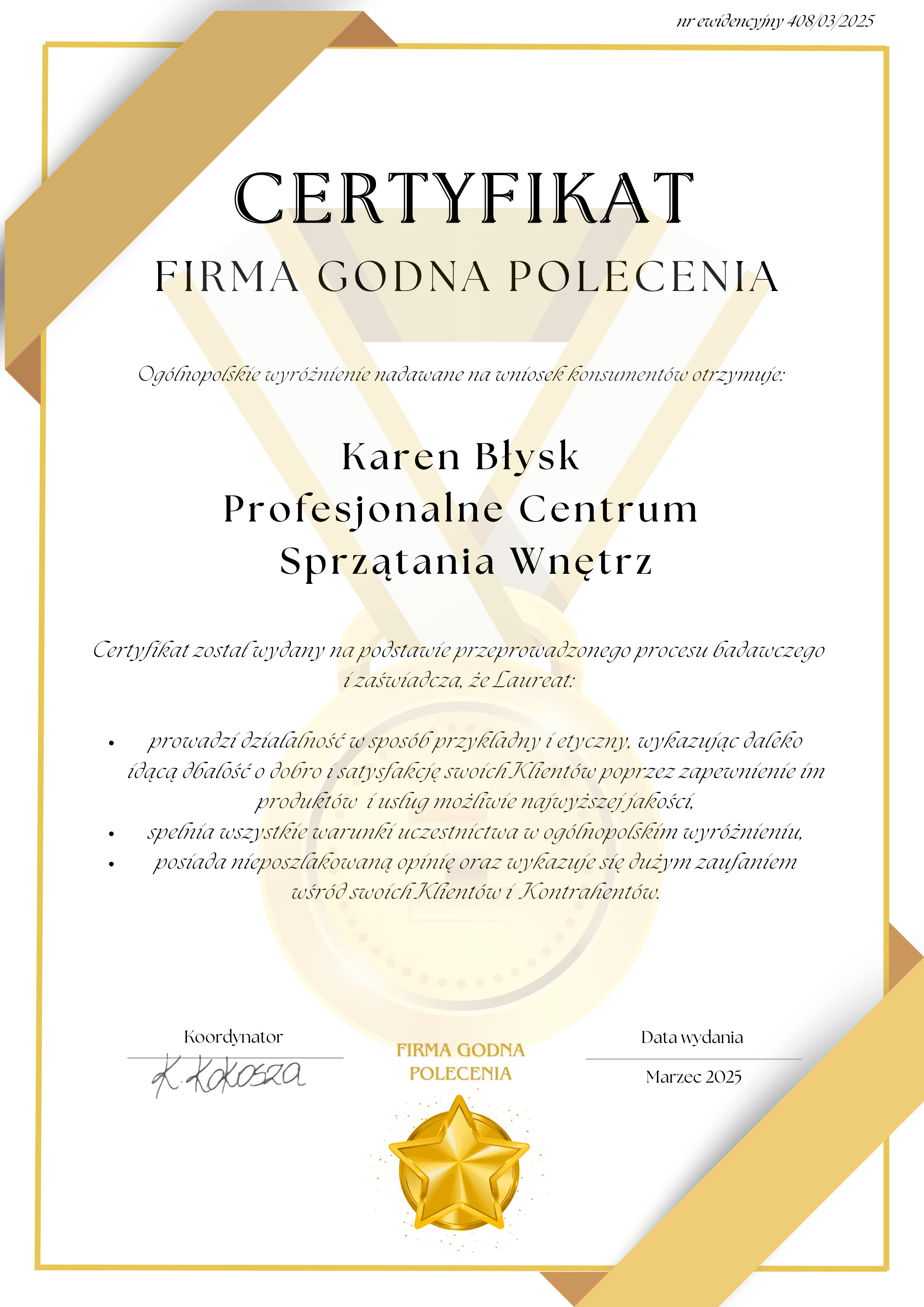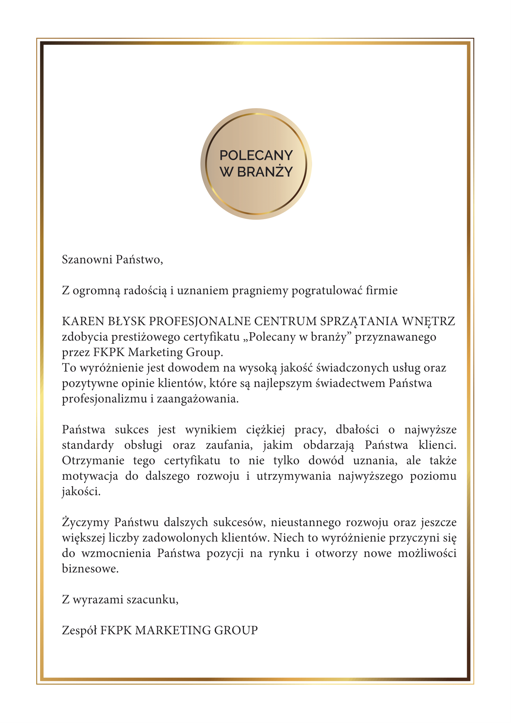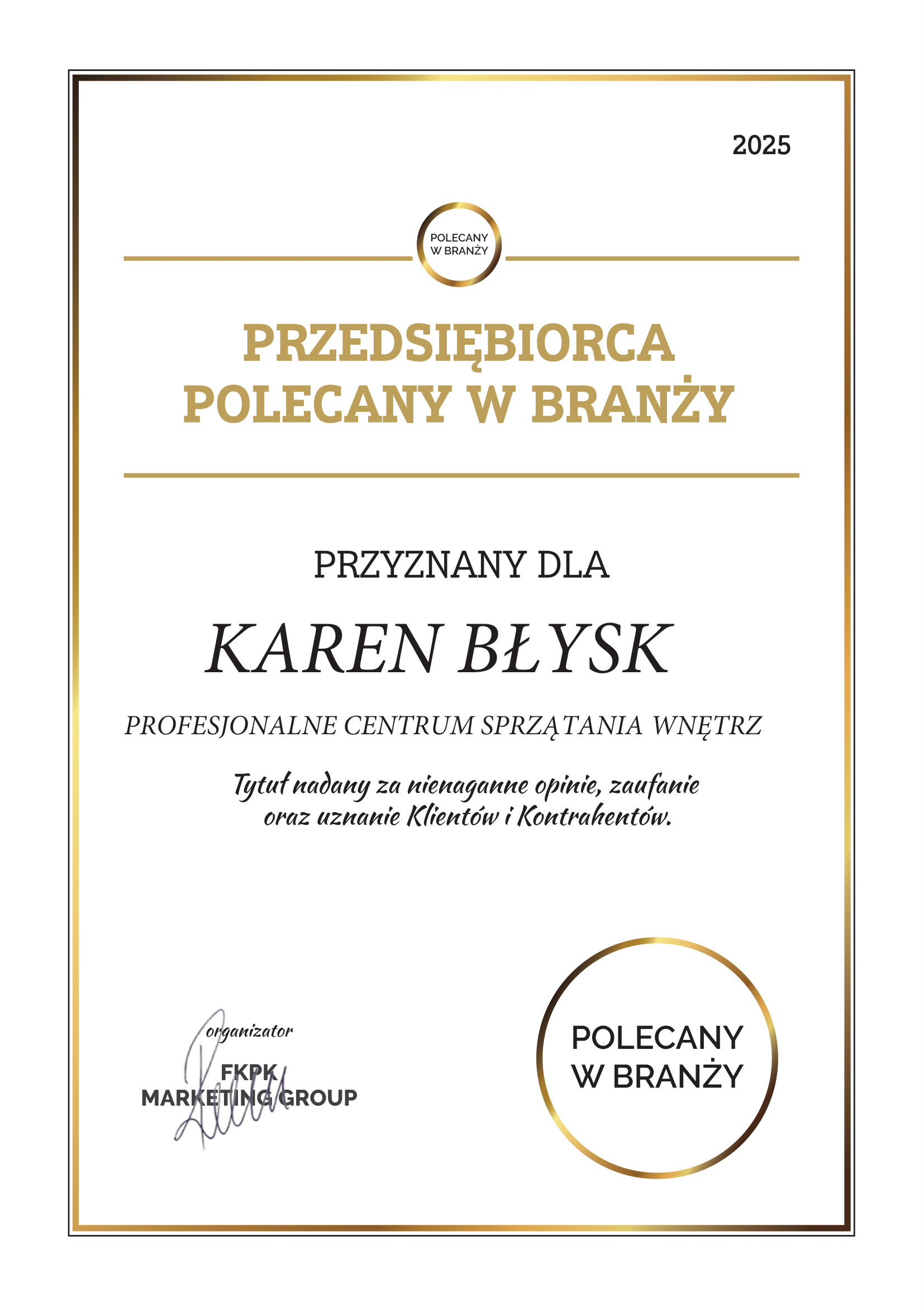 Tytuł przyznany przez FKPK MARKETING GROUP za nienaganne opinie, zaufanie oraz uznanie klientów i kontrahentów. Wyróżnienie to potwierdza naszą pozycję jako profesjonalnego centrum sprzątania wnętrz, które cieszy się zaufaniem zarówno klientów indywidualnych, jak i biznesowych.
